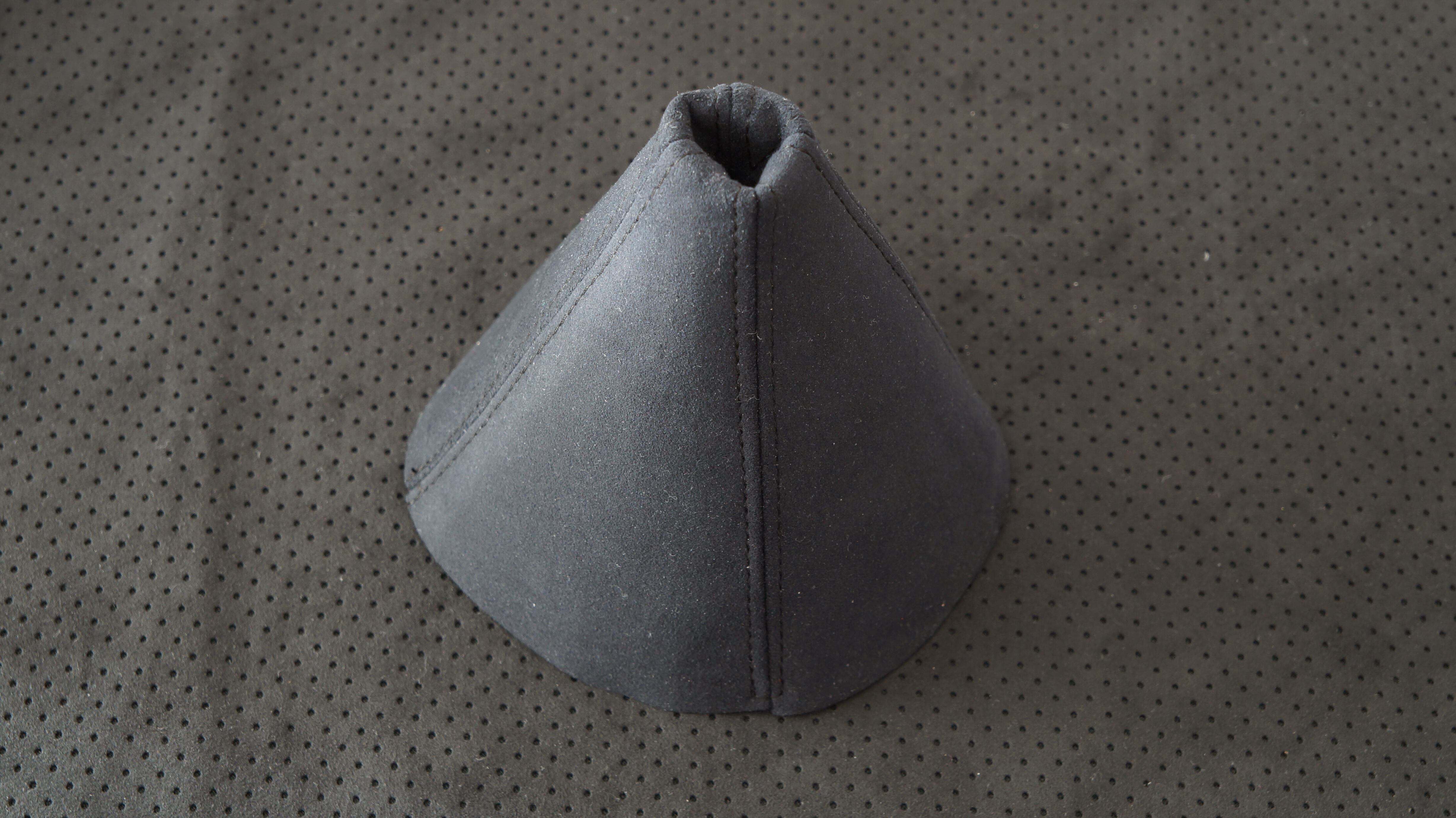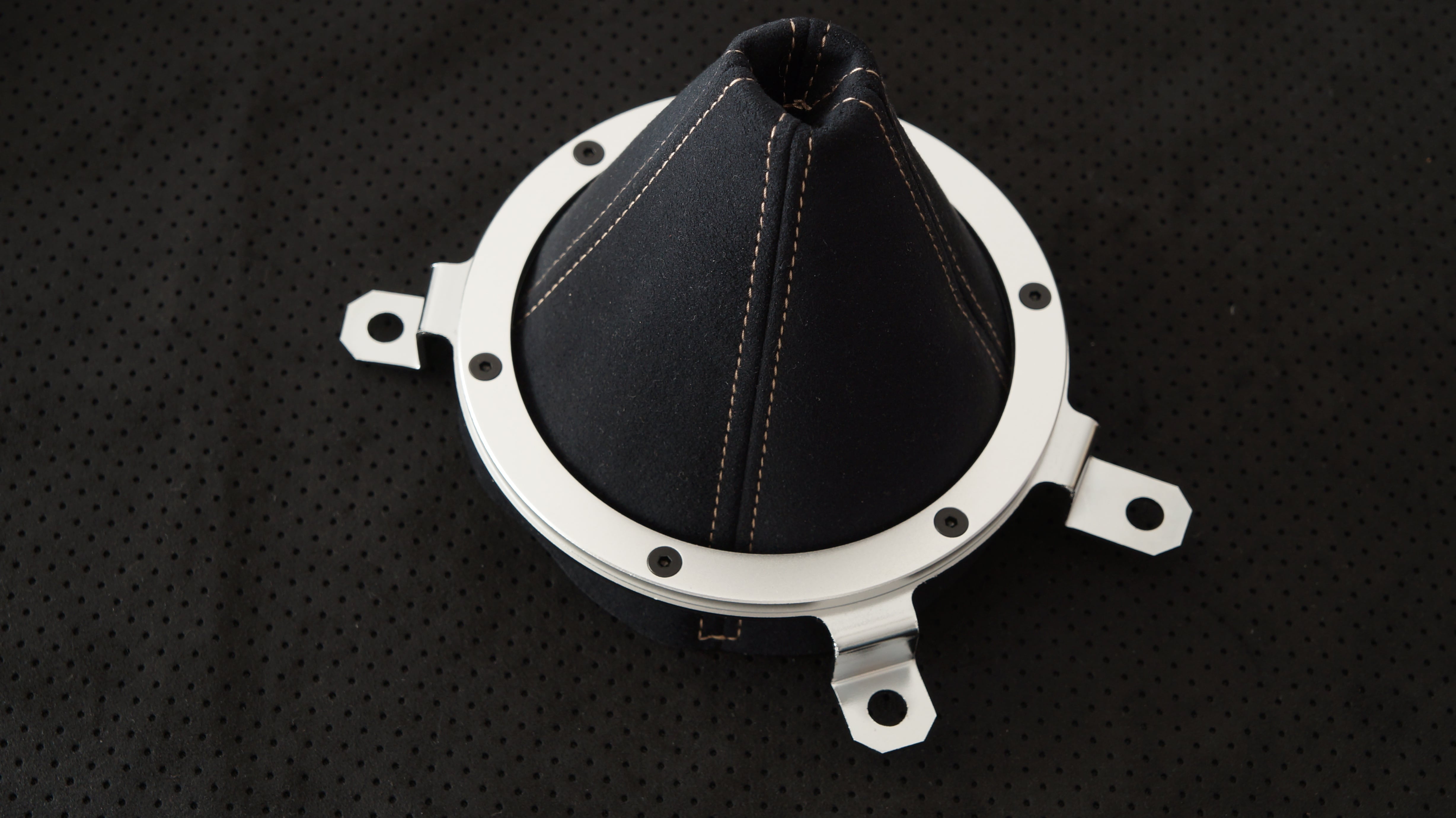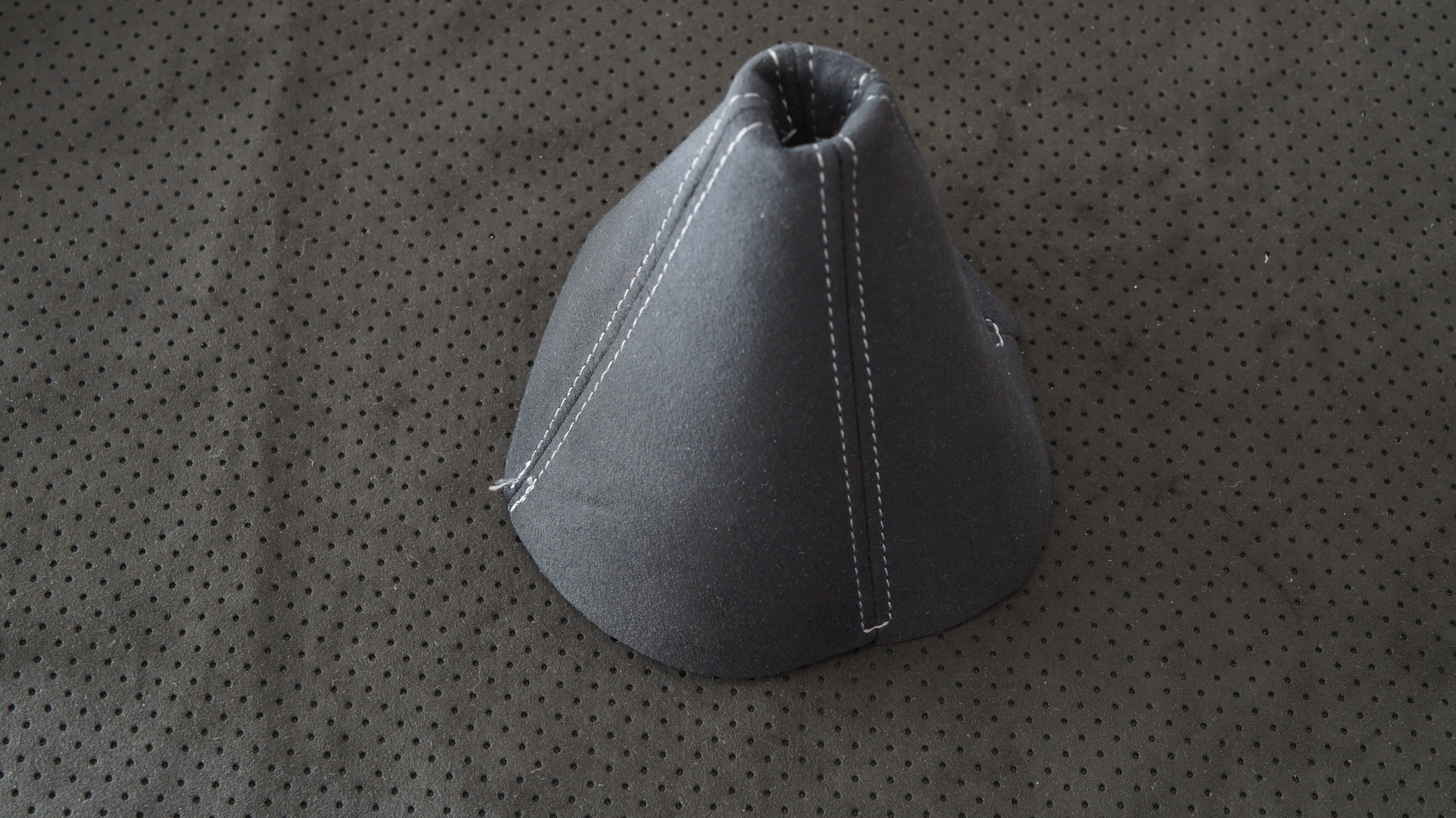 参考画像のようにポルシェ内装にも使われている ウルトラスエードのBlack colorで作成した M2 1028コンソールレスカーペット寸法で作成したシフトブーツです。ステッチの色をお選びください。 ネジ穴など加工が必要となります。 別出品のアルミリングと寸法が合います。 生産に1週間ほどお時間をいただく場合があります。アルミリング、取り付け金具、ねじ は付属しません。