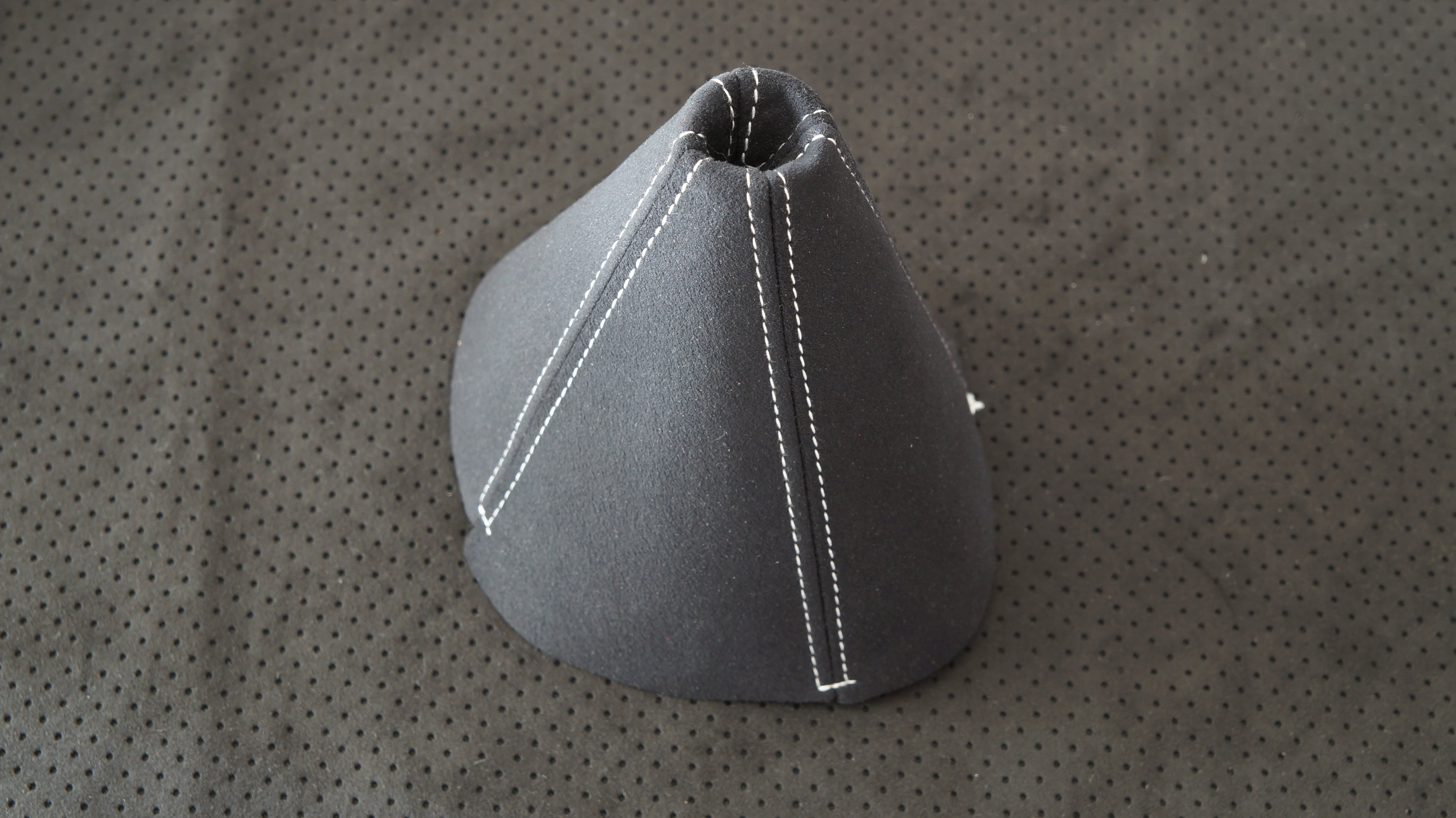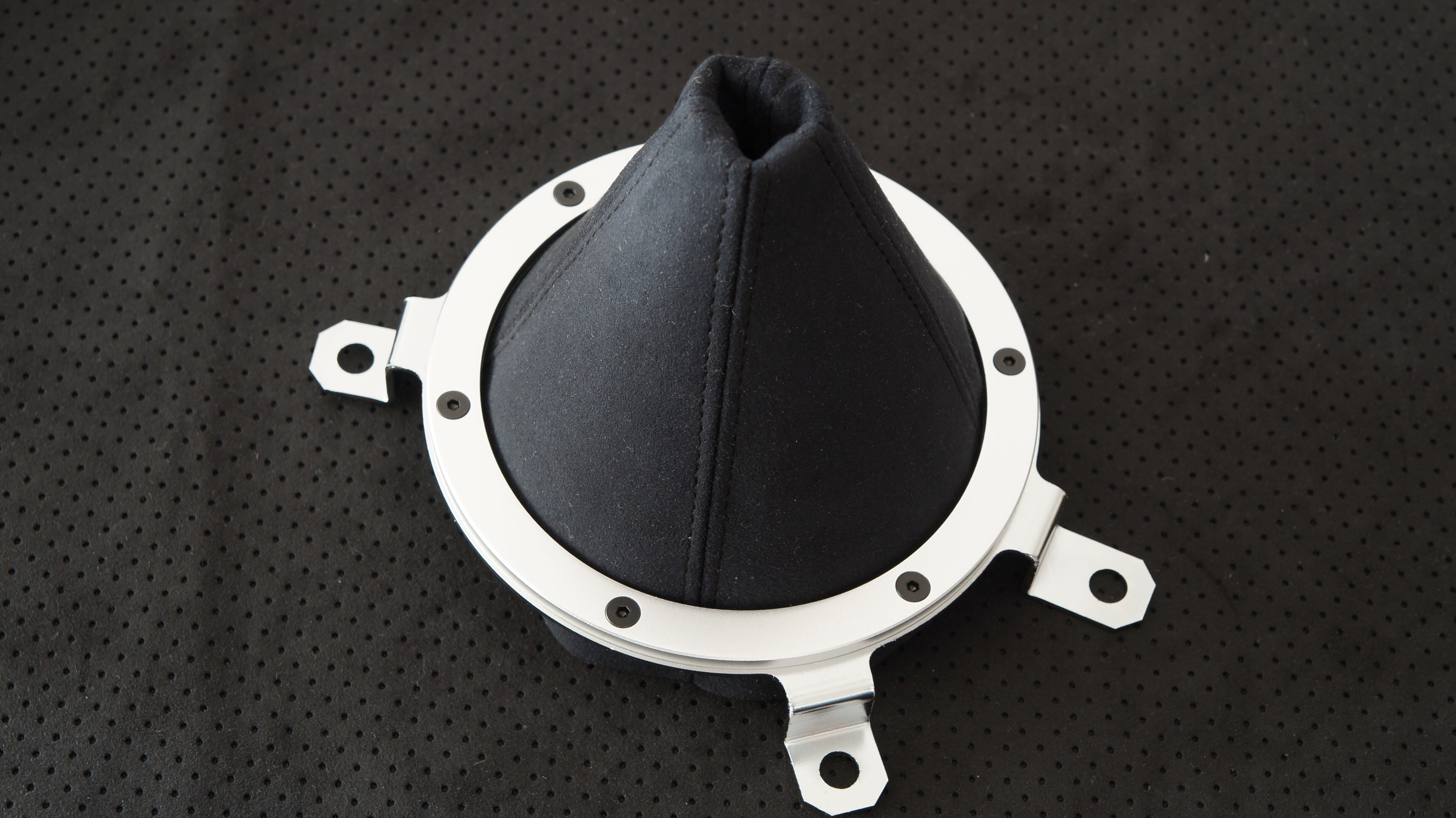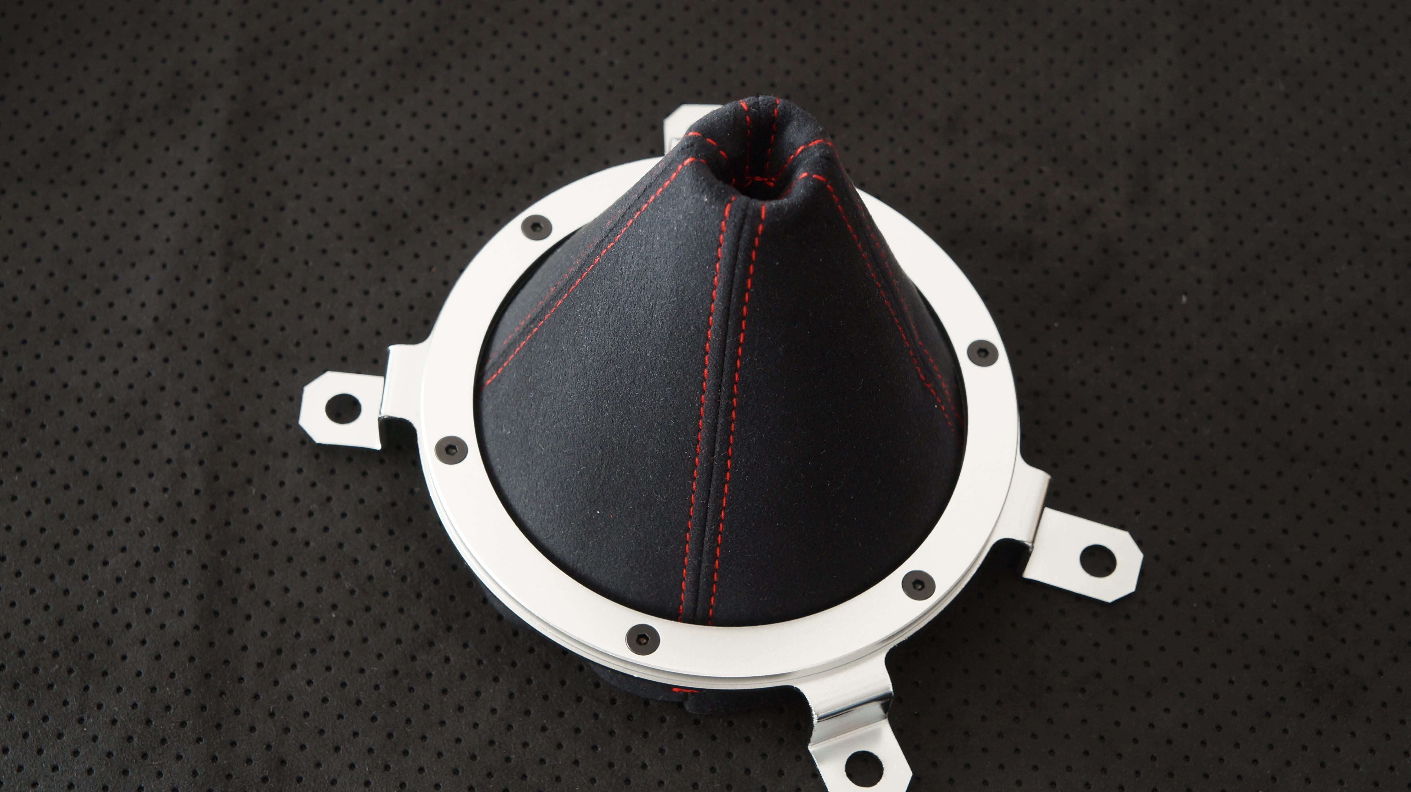 参考画像のようにポルシェ内装にも使われている ウルトラスエードのBlack colorで作成した M2 1028コンソールレスカーペット寸法で作成したシフトブーツです。ステッチの色をお選びください。 ネジ穴など加工が必要となります。 別出品のアルミリングと寸法が合います。 生産に1週間ほどお時間をいただく場合があります。アルミリング、取り付け金具、ねじ は付属しません。