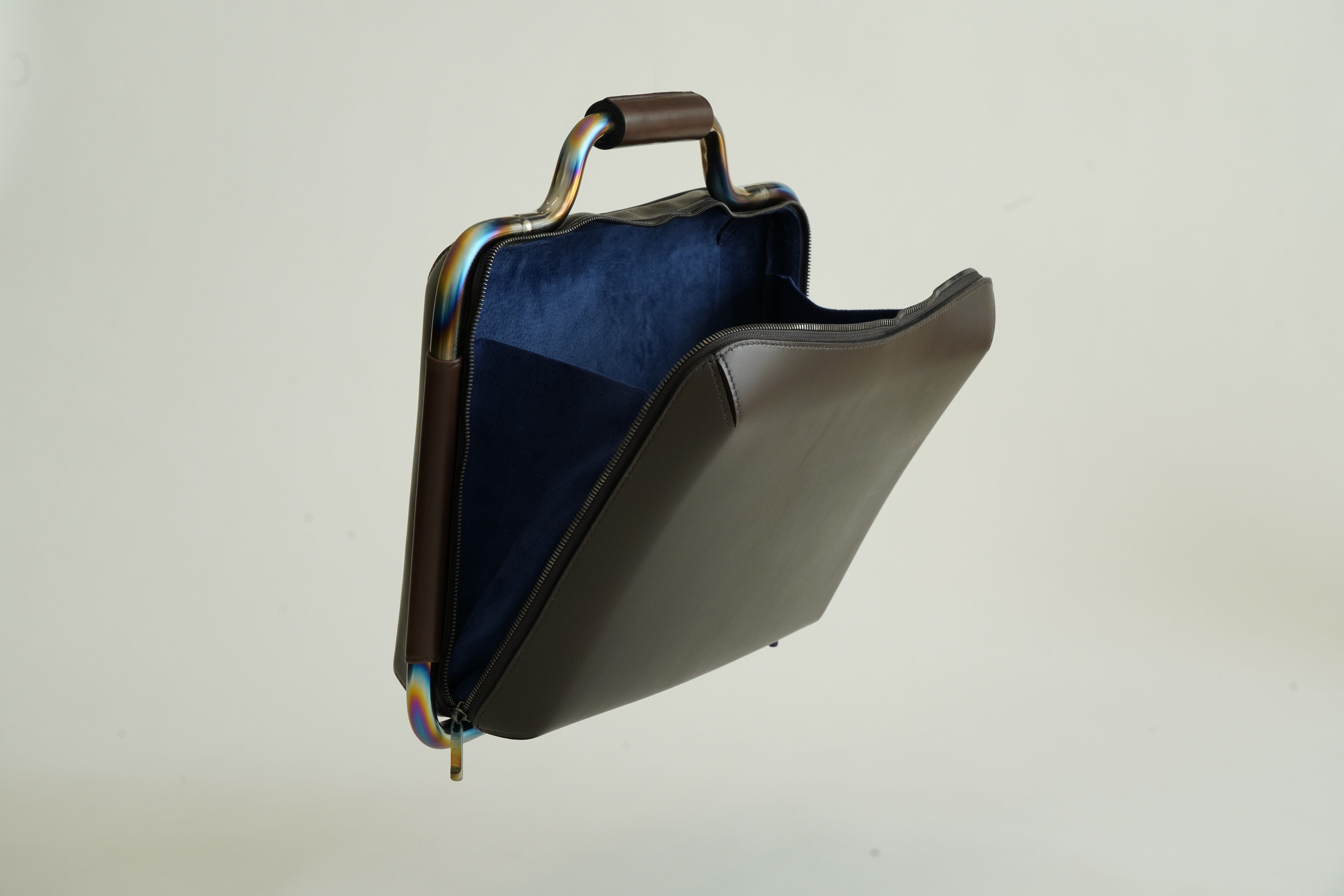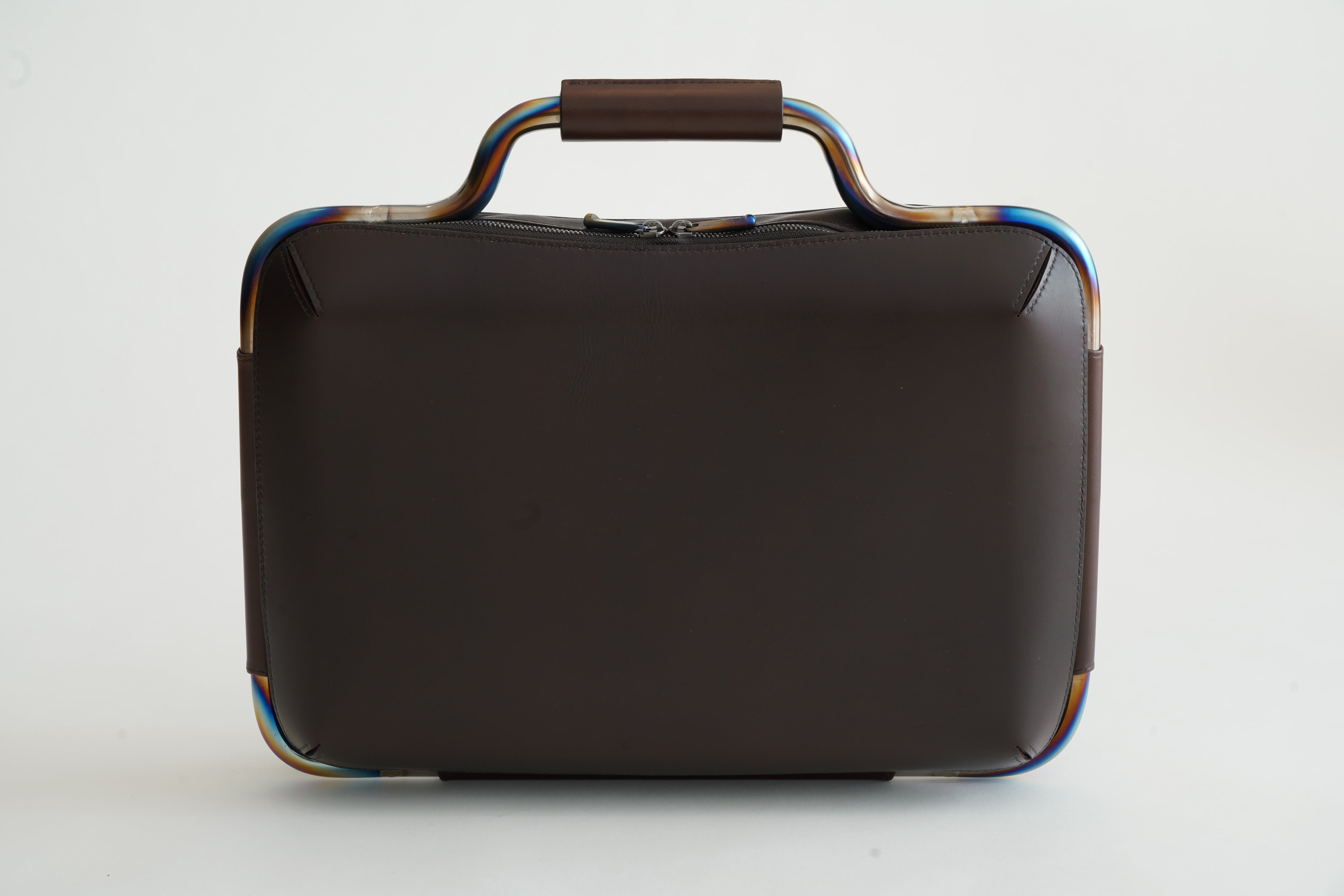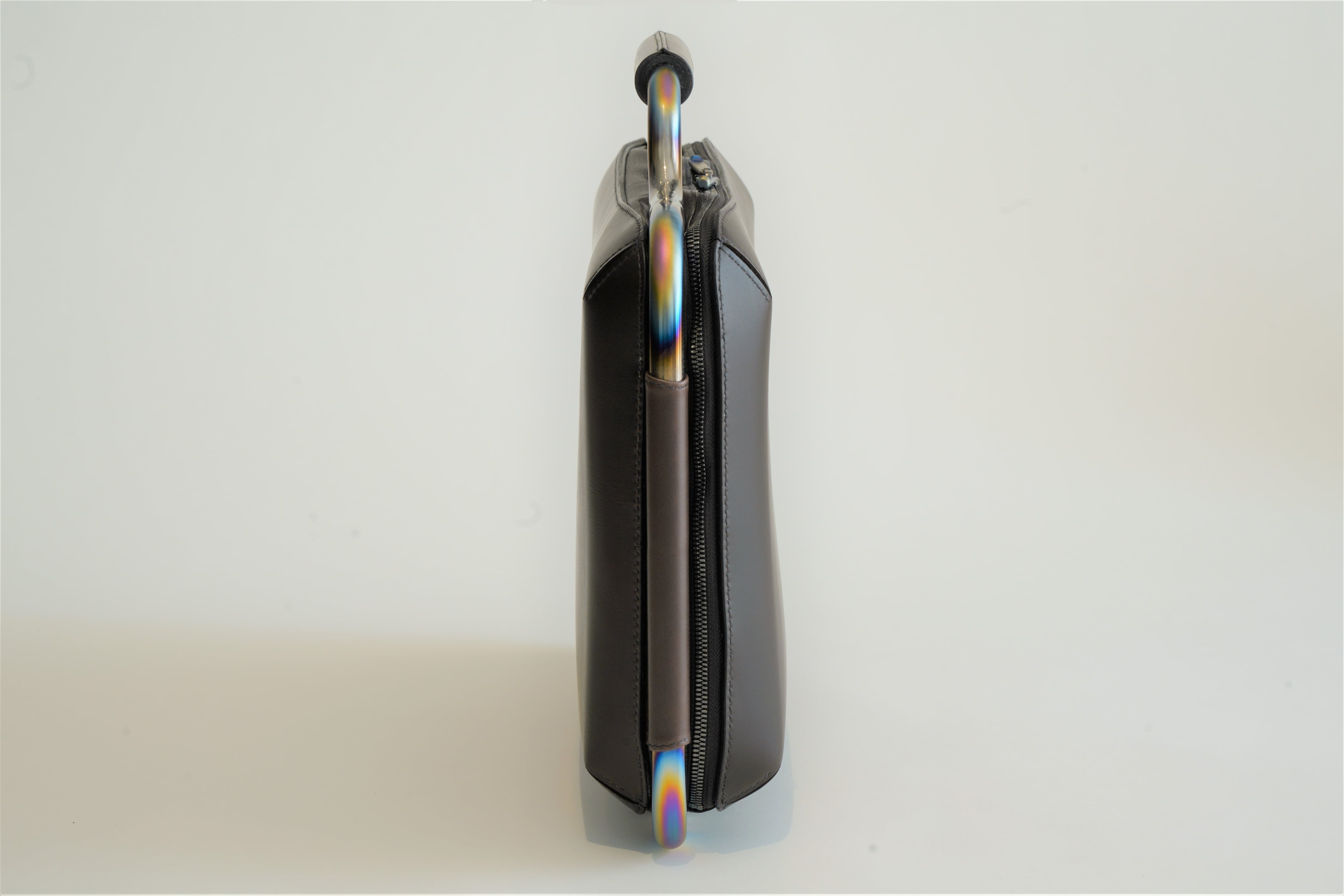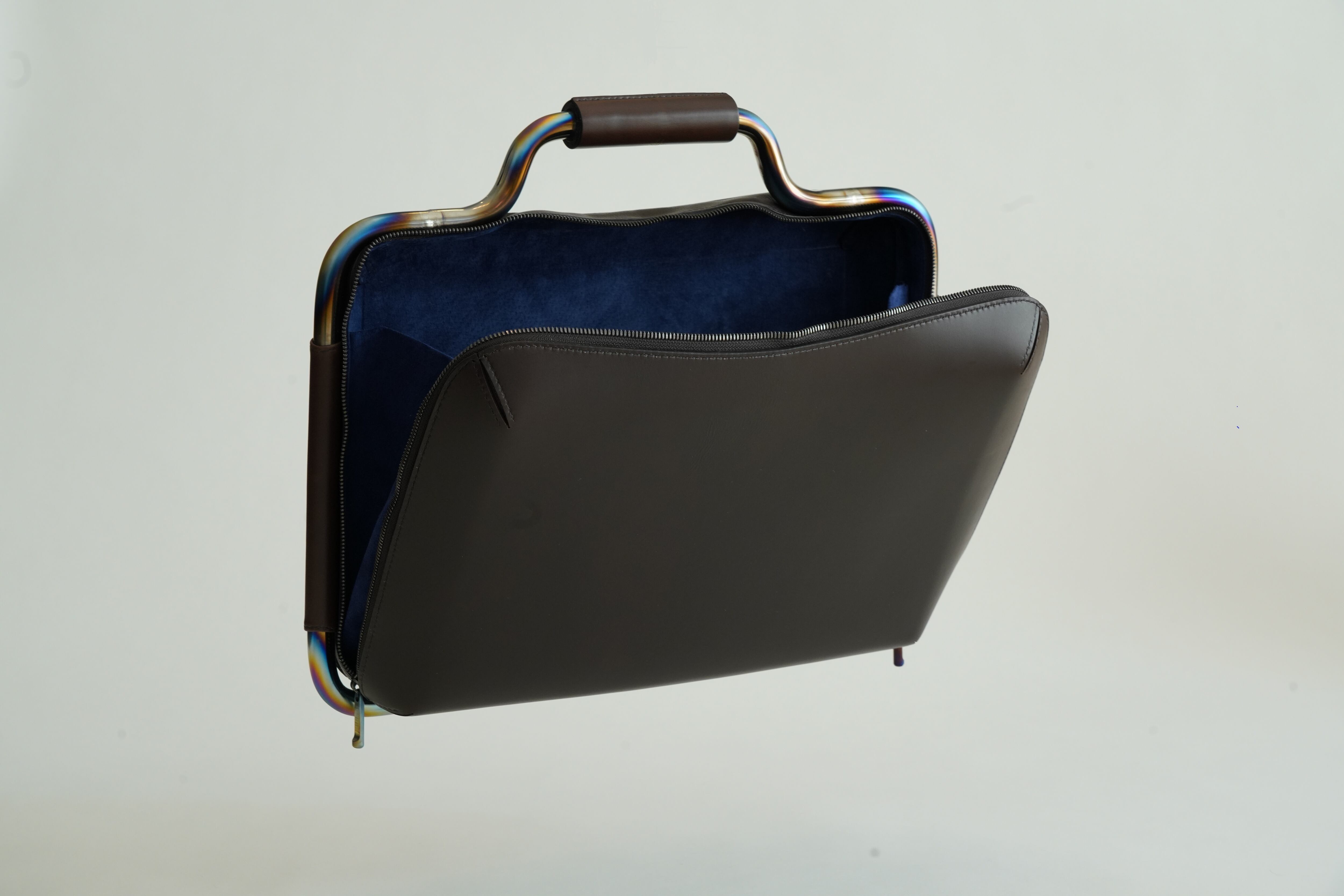 モーターバイクのマフラー職人による手曲げチタンパイプフレーム(虹彩色)と機械曲げ(素地チタン色)のフレームを用いて、総手縫い本革のビジネスバッグ作成しています。