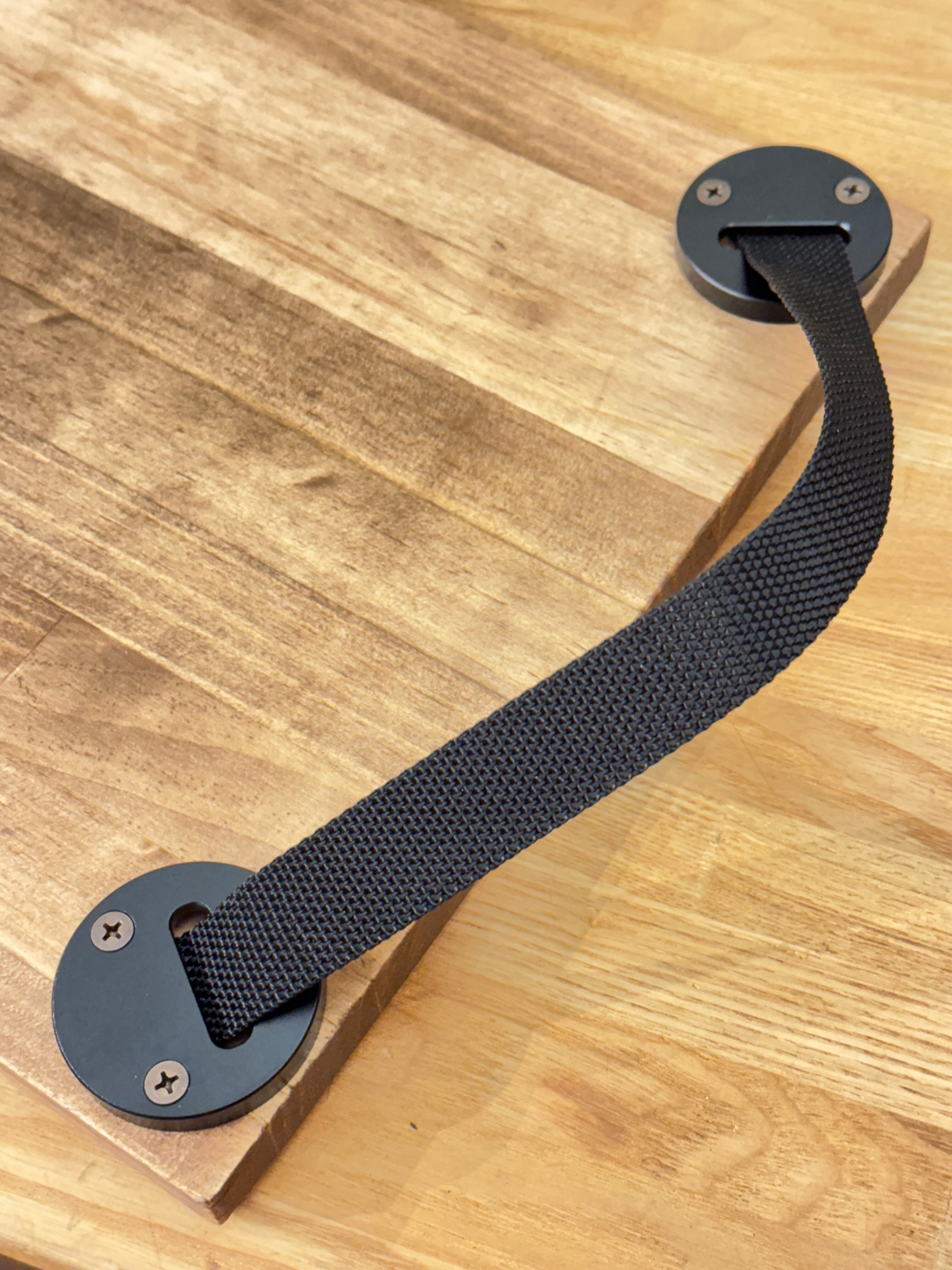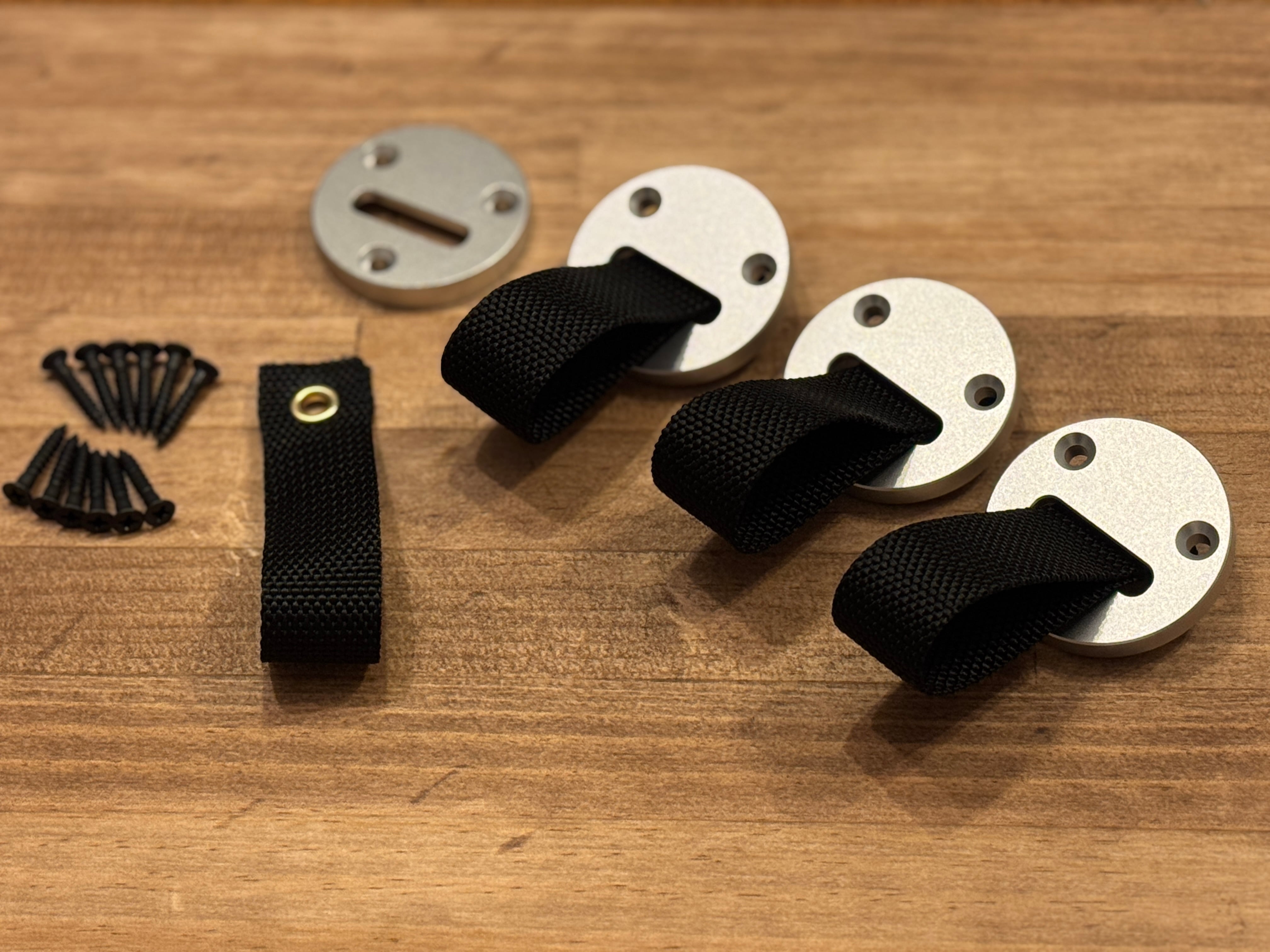 アルミ無垢材から削り出し、サンドブラスト、アルマイト仕上げを施したストラップホール4枚セットです。ポルシェ911GT3RS のインナードアハンドルのデザインを様々なものに付加できます。