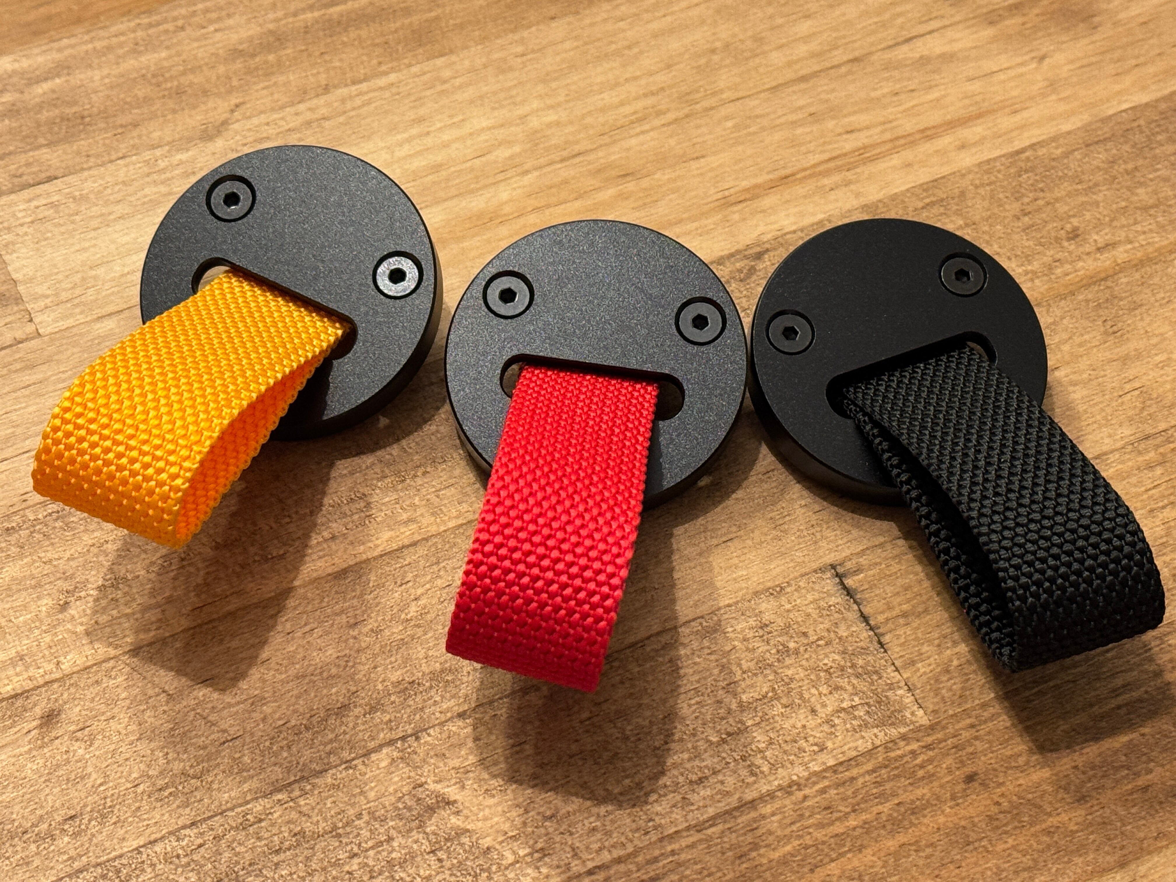 アルミ無垢材から削り出し、サンドブラスト、アルマイト仕上げを施したストラップホール2枚セットです。ポルシェ911GT3RS のインナードアハンドルのデザインを様々な車種のインナードアハンドルとして付加できます。